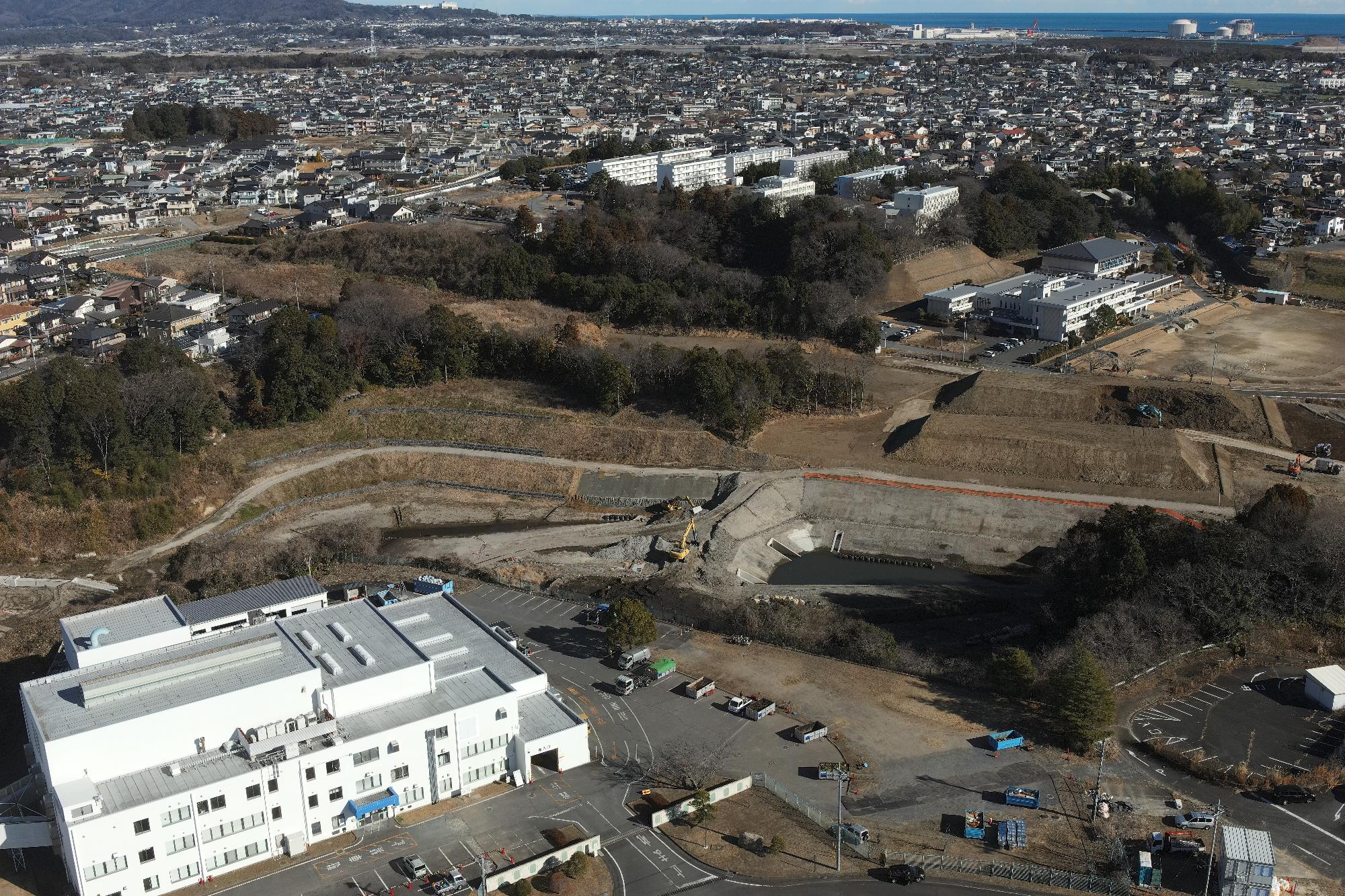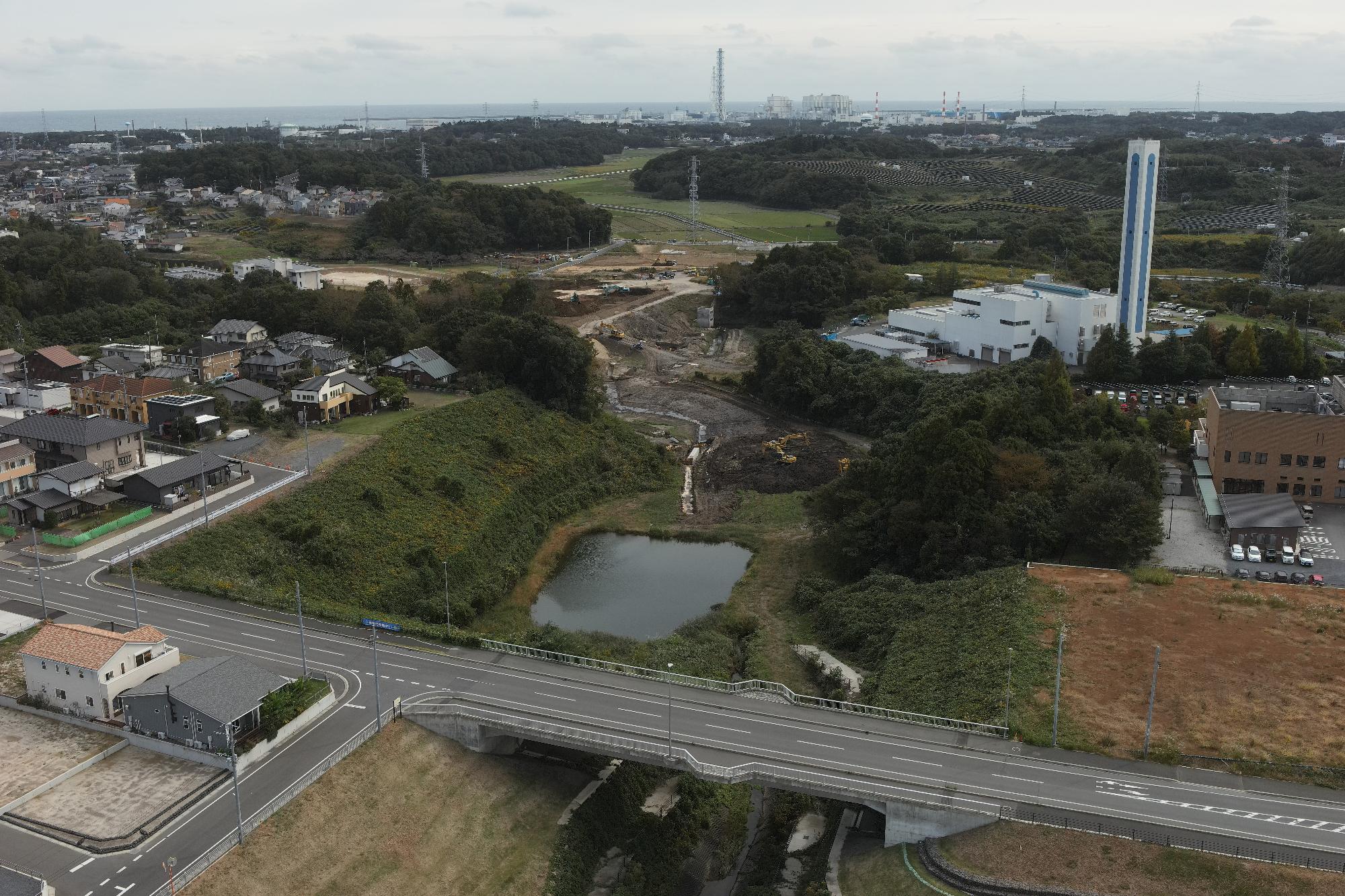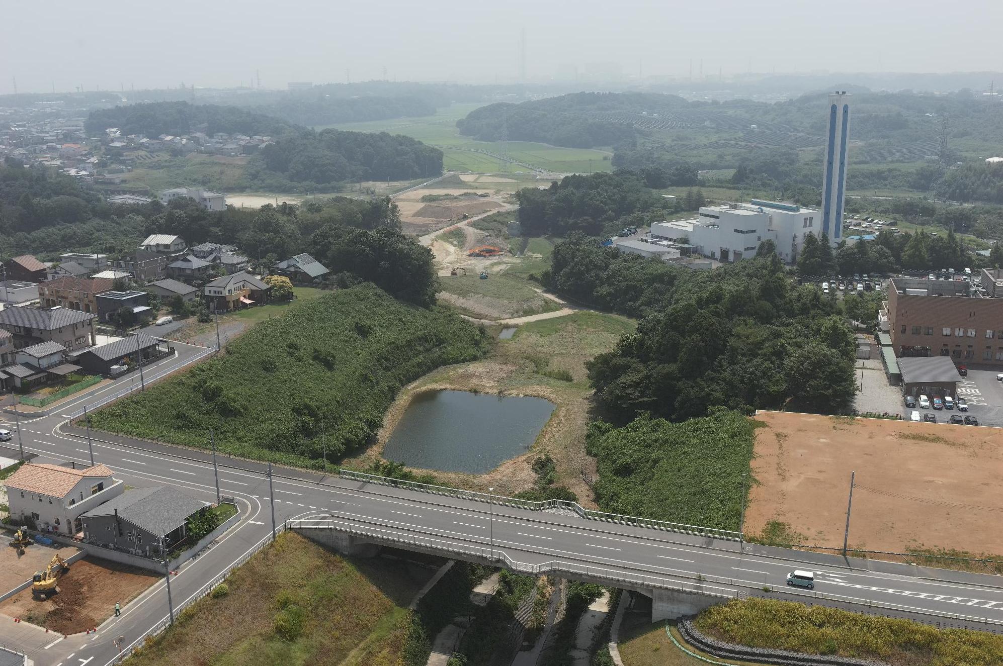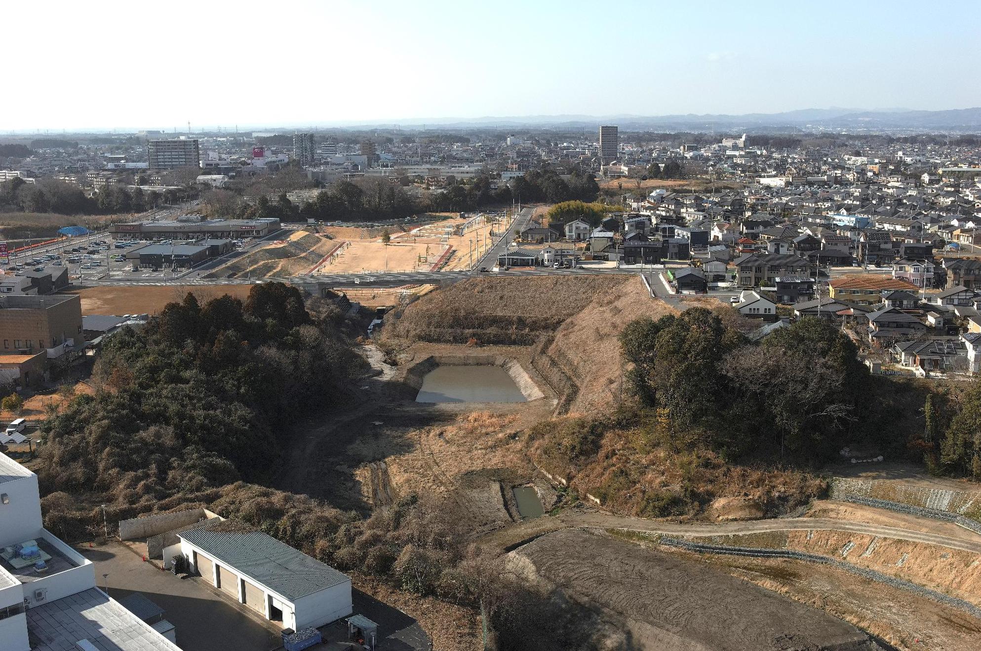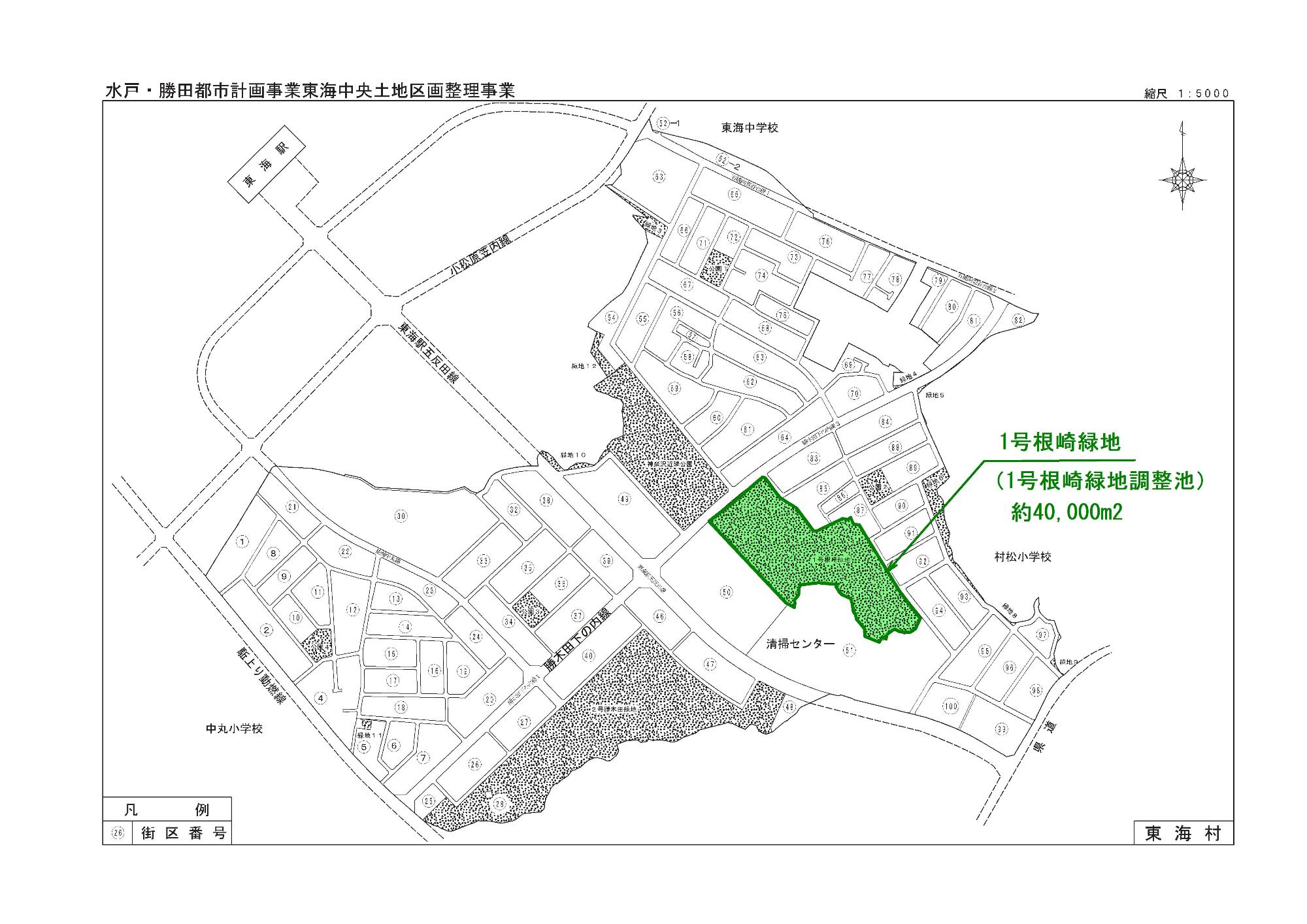 水戸・勝田都市計画事業東海中央土地区画整理事業地内の中央部にある1号根崎緑地全体が調整池になります。