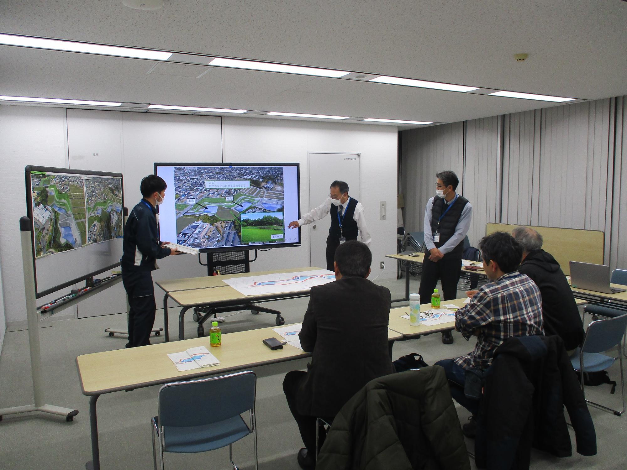各団体の皆様に1号根崎緑地調整池の整備計画を報告し,さまざまな意見,アドバイスをいただきました。ありがとうございました。