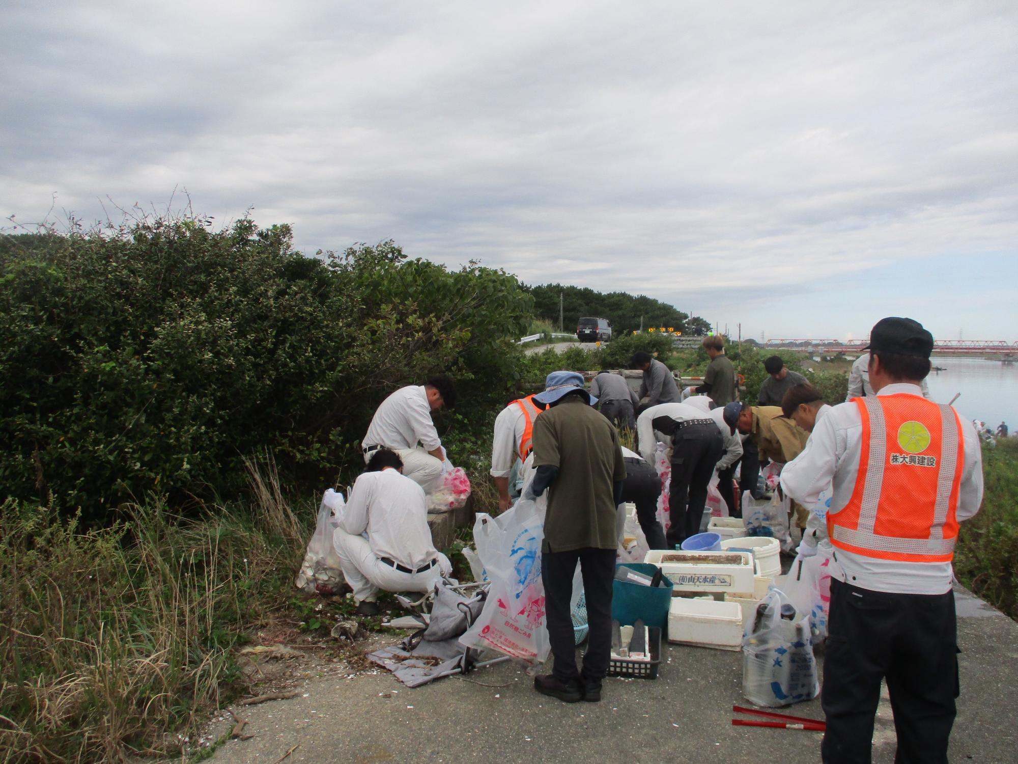 意見交換会でお世話になっている自然共生社会部会が開催する豊岡プラごみクリーンアップ作戦に参加させていただきました。東海村建設業共同組合や東海村造園建設協力会の皆様も参加しており,今年は過去最多の166名とのことでした。今後の1号根崎緑地調整池の維持管理等の参考にさせていただきました。