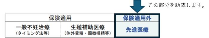 村では,不妊治療における経済的負担を軽減するため,保険診療で実施した生殖補助医療(体外受精及び顕微授精等)と併用して実施した保険適用外の先進医療にかかる費用の一部を助成します。