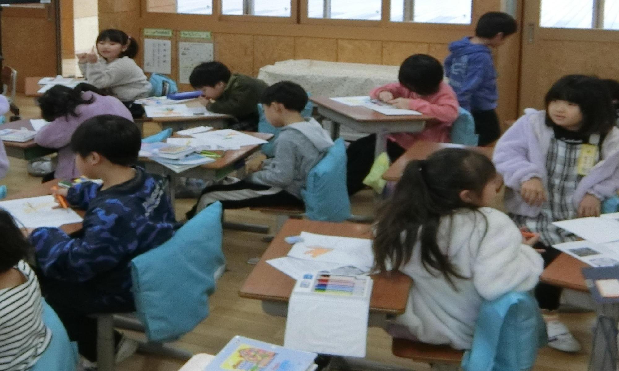 小学校1年生の授業の様子(東海村のシンボルの塗り絵)