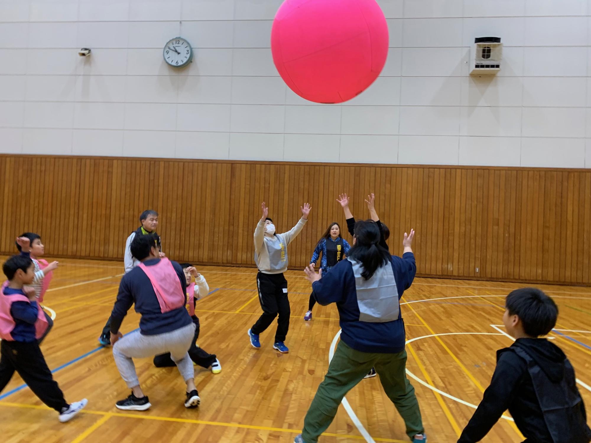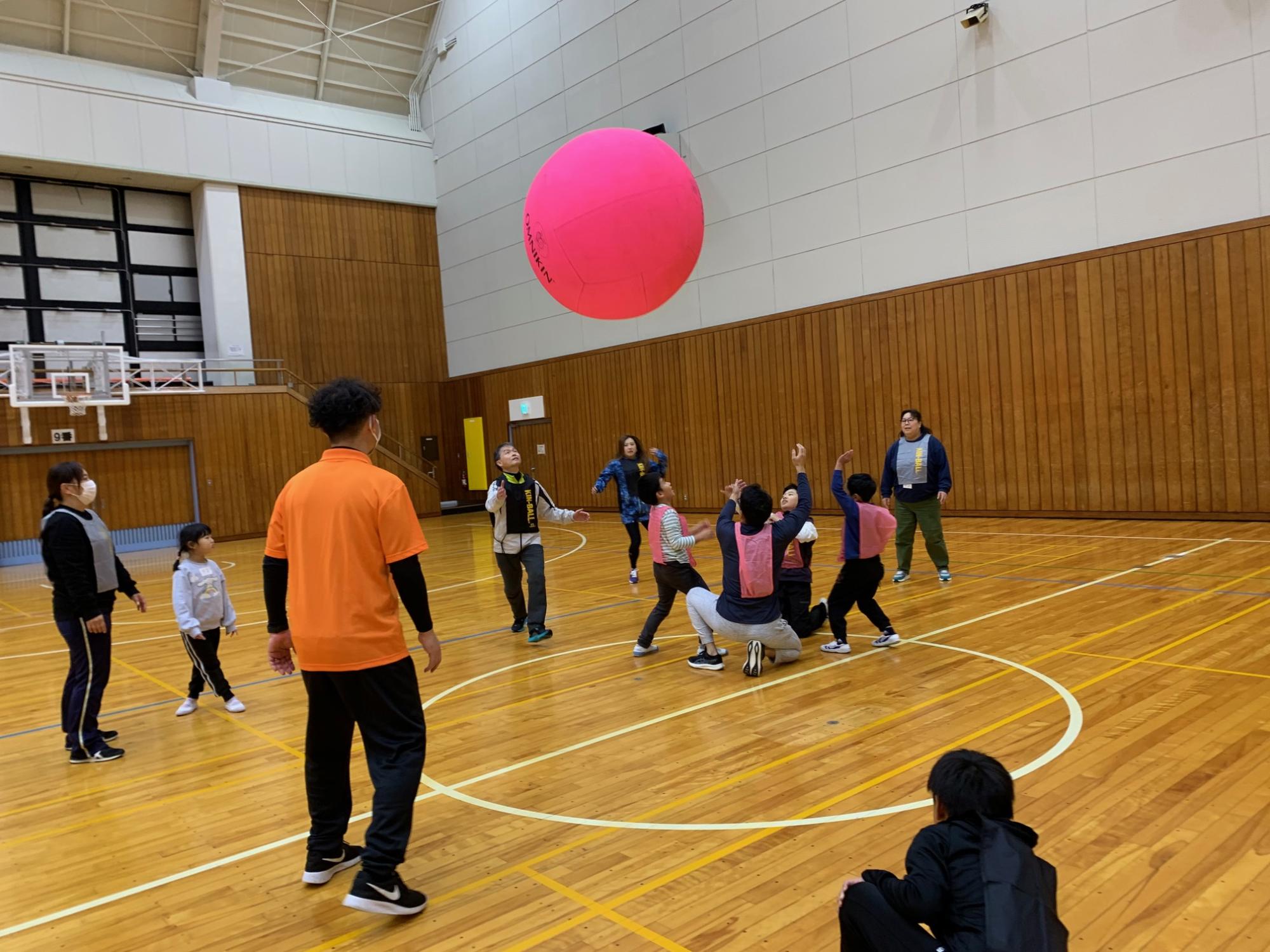 巨大で軽いアドバルーンのようなボールを,床に落とさないようにチームで協力し合うスポーツです。