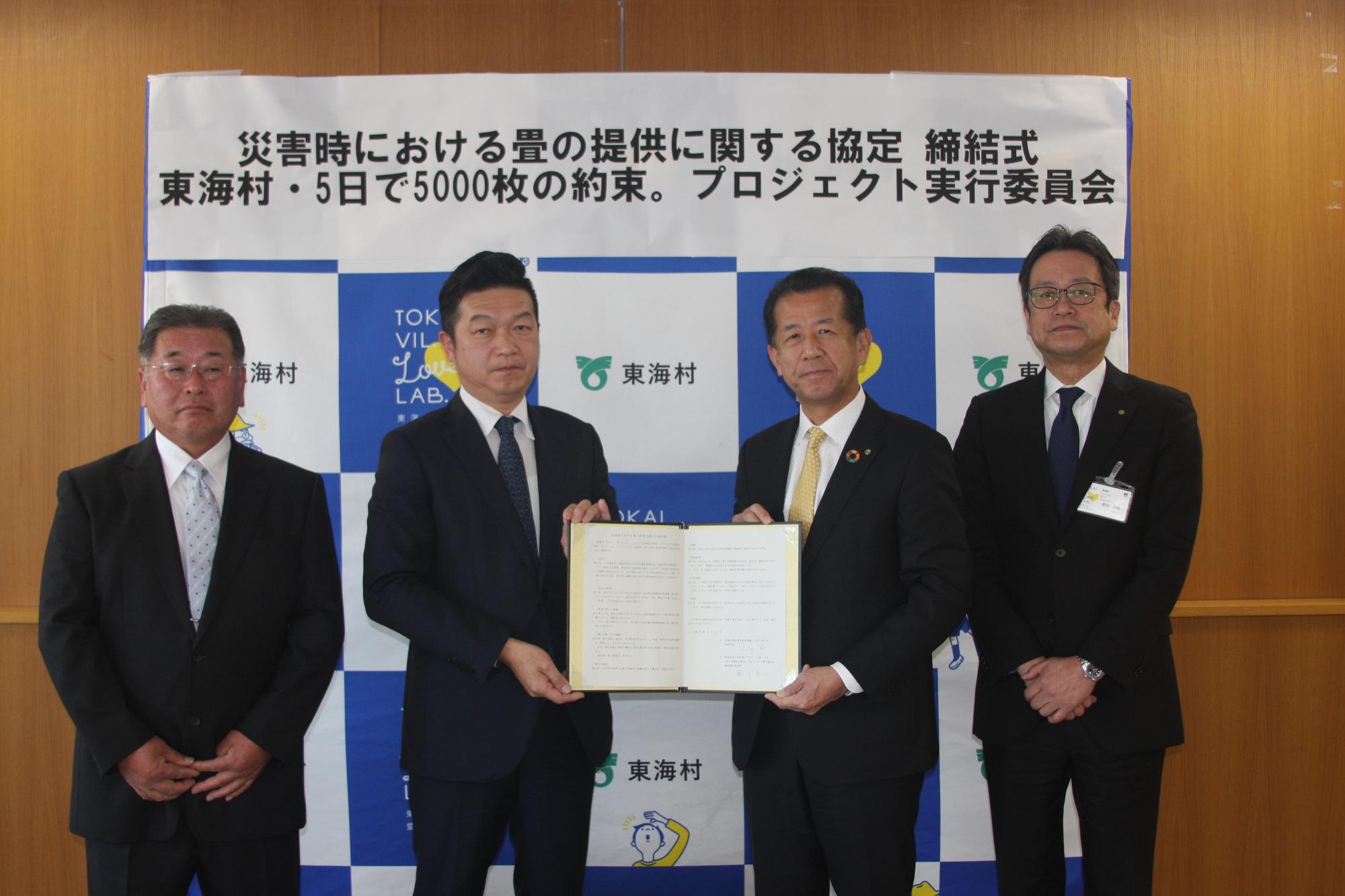 村では,令和4年度東海村広域避難訓練(10月18日実施)において,「5日で5000枚の約束。プロジェクト実行委員会」から畳の提供を受けて避難所設営訓練を実施したことを契機に,3月20日,同プロジェクト実行委員会と「災害時における畳の提供に関する協定」を締結しました。