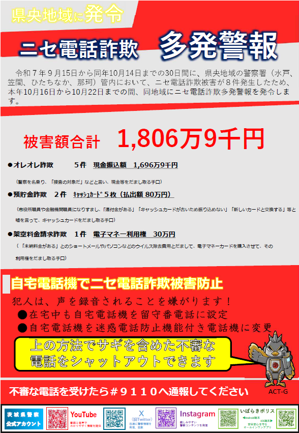 令和7年9月15日から同年10月14日までの30日間に、県央地域の警察署(⽔⼾、 笠間、ひたちなか、那珂)管内において、ニセ電話詐欺被害が8件発生したため、 本年10月16日から10月22日までの間、同地域にニセ電話詐欺多発警報を発令されました。