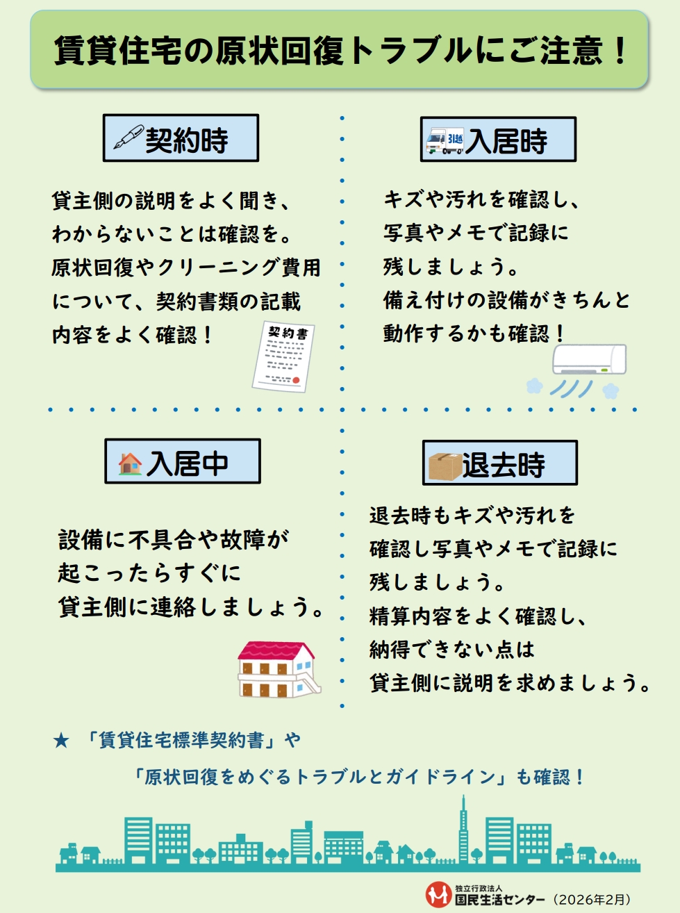 国土交通省が「賃貸住宅標準契約書」や「原状回復をめぐるトラブルとガイドライン」を示しています。契約を締結する前や退去時に読んでおくと、契約内容を確認する際や原状回復の考え方の参考になります。