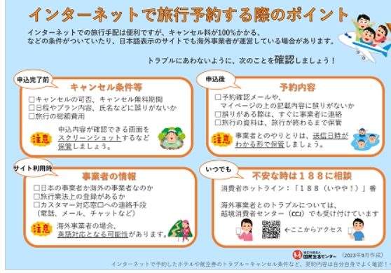 インターネットでの予約は便利ですが、「キャンセル料が100%かかる」等の条件が付いている場合があります。また、日本語表示のサイトでも運営事業者は海外の事業者である場合もあります。インターネットで予約する際は、契約内容や、事業者の問い合わせ先(カスタマー対応窓口)を自分自身でしっかり確認して利用しないと、思わぬトラブルにあうことがあります。